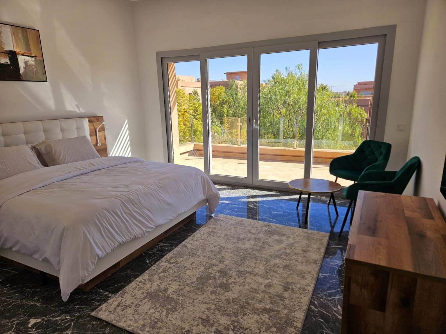 À l’étage, trois superbes suites vous attendent, dont une somptueuse suite master offrant une vue imprenable sur les montagnes de l’Atlas. Chaque suite bénéficie de finitions haut de gamme et de salles d’eau élégantes.